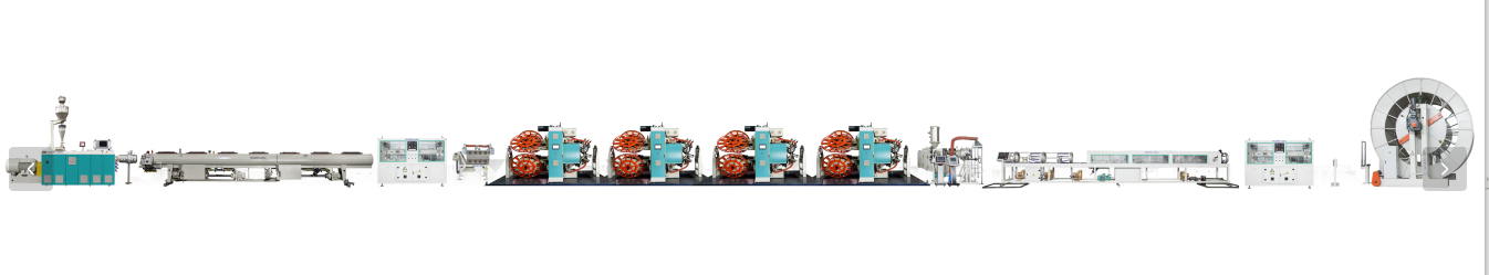 Ligne d'extrusion de tuyaux thermoplastiques renforcés (RTP)se compose de trois parties. La première partie est l’unité intérieure d’équipement d’extrusion de tuyaux en plastique ; La deuxième partie est l'unité d'équipement d'enroulement renforcée par fil non métallique de couche intermédiaire ; La troisième partie est l'extérieurUnité d'équipement d'extrusion de revêtement HDPE. Il présente les avantages d'un rendement élevé, d'une vitesse élevée, d'une automatisation élevée et d'une économie d'énergie. C'est un équipement idéal pour produire des tuyaux composites RTP.