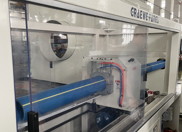 Quatrièmement, le tuyau est transporté par l'unité de traction à chenilles et envoyé dans le coupeur où le tuyau est coupé selon la longueur prédéfinie ; en même temps, la poussière de coupe est éliminée par le dépoussiéreur.