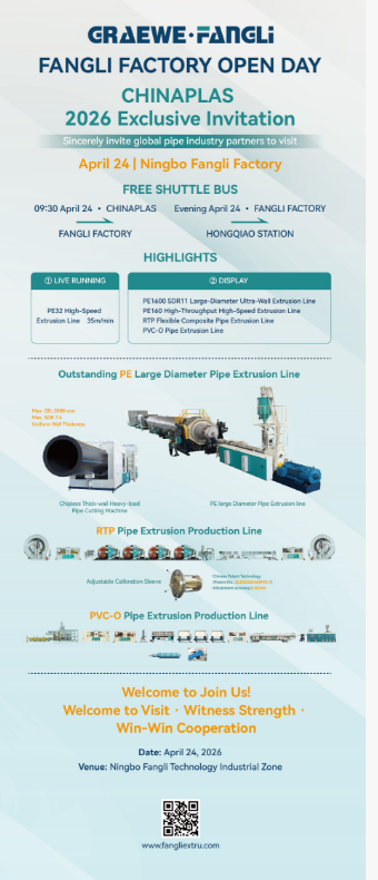 Du 21 au 24 avril au CHINAPLAS 2026, visitez Fangli Technology au stand 7.1C14. Explorons ensemble l'innovation et la coopération future dans le domaine des équipements de canalisations en plastique !